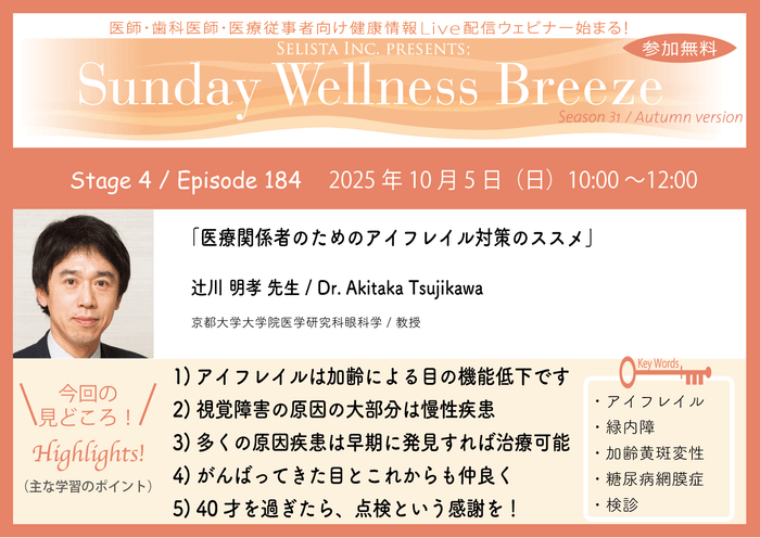 セリスタ株式会社(東京都千代田区 代表取締役 伊藤 承正)は、2025年10月5日(日)に、辻川 明孝 先生(京都大学大学院医学研究科眼科学 / 教授)を講師にお迎えし、医師・歯科医師などの医療従事者向け無料Zoomオンラインセミナー『医療関係者のためのアイフレイル対策のススメ』を開催します。