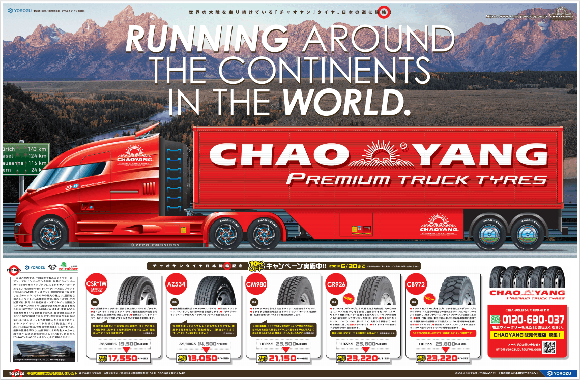 株式会社ヨロズ物流(所在地:大阪府富田林市、代表取締役:新谷 剛)は、世界有数の総合タイヤメーカーである中国のZHONGCE RUBBER GROUP CO.,LTD.(所在地:中国浙江省杭州市)のトップブランド「CHAOYANG(チャオヤン)」のダンプ用タイヤを日本で初めて*取り扱い開始しました。*当社調べ