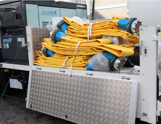 2019年9月、横浜市の観測史上最大となる1時間あたり100mmの降雨が観測され、多数の浸水被害が生じていました。台風のように事前に予測ができる豪雨に備えて排水ポンプ車を待機させ、道路冠水などの被害が多発・長期化する箇所における被害の早急解消を目的に、横浜市初となる排水ポンプ車が導入されました。2tトラックでコンパクトなため、狭い路地も運転しやすくなっています。