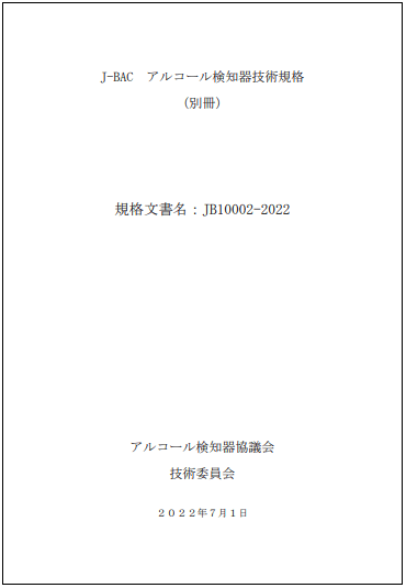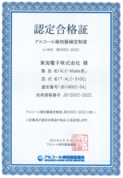 アルコール検知器協議会では、一定の性能基準を満たす機器の認定を行っています。この度当社は技術規格JB10002-2022という技術規格の試験に合格し、認定を受けました。