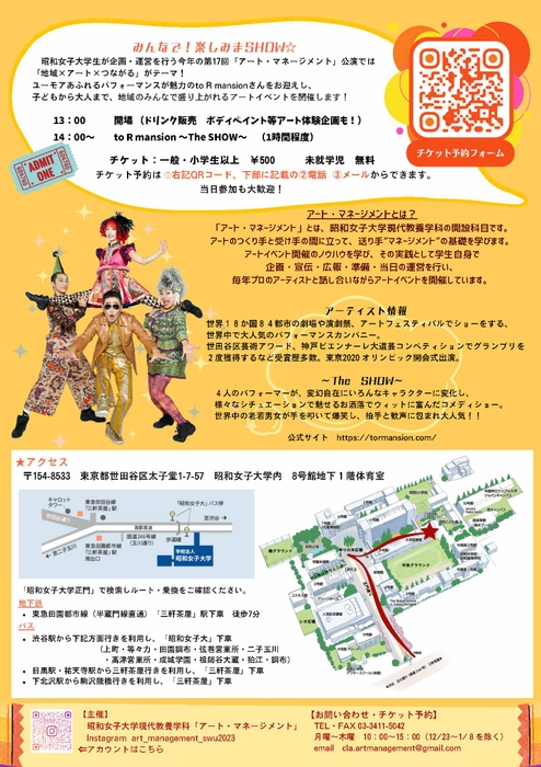 昭和女子大学(学長 金尾朗:東京都世田谷区)環境デザイン学科の三星安澄特命講師の研究室が2024年1月10日から東京ミッドタウンで開かれる「ゼミ展 20昭和女子大学(学長 金尾朗:東京都世田谷区)で1月20日、現代教養学科「アート・マネージメント」の受講生がアート・イベント「みんなで!楽しみまSHOW☆」を開催、東京オリンピック2020開会式はじめ世界各地の演劇祭などで人気のパフォーマンスカンパニー「to R mansion」が出演します。