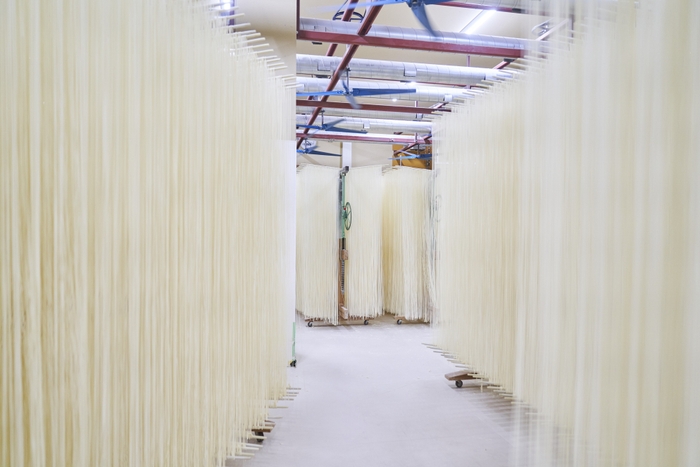 オカベでは製造の各工程において、しっかり時間を取って麺の熟成を促します。また最終工程の乾燥でも、麺の表面は乾燥させながらも中心部の水分は逃さないために、急激に乾かすのではなく時間をかけて低温でゆっくりと乾燥させていきます。そのため一つの麺が出来上がるのにかかる時間は約30時間。
