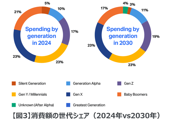 現在、Z世代は世界の消費総額(57兆6,000億ドル)の約17%を占め、今後6年でその割合は19%に達すると予測されています(図3)。