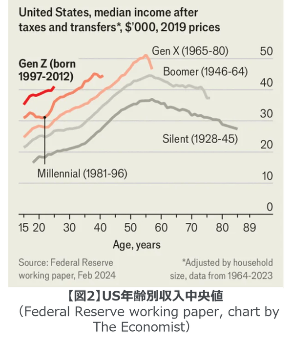 Z世代は、かつてないほど裕福な世代でもあります。例えば、アメリカの25歳の平均世帯年収は4万ドルを超え、これは(税金、政府移転支出、インフレを考慮しても)ミレニアル世代やベビーブーマー世代の同年齢と比べて大幅に高い水準です(図2)。