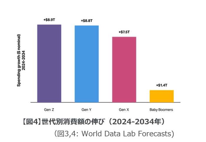 また、今後10年間で最も消費額の伸びが顕著な世代となるとされています(図4)。このような背景から、Z世代の消費動向を理解し、迅速に対応することが、企業にとってますます重要な課題となっています。