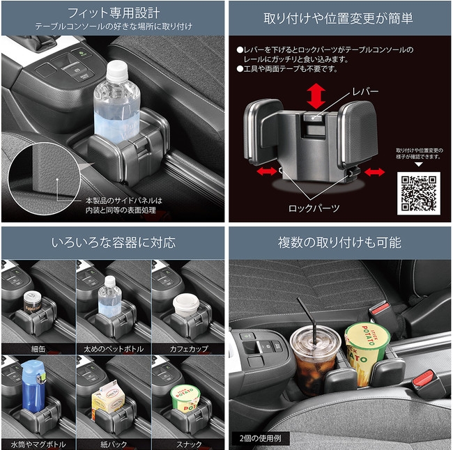 本製品は、センターコンソールのレール部分にレバー操作で着脱可能、簡単にドリンク置き場を設置できます。また、フィットの内装カラーや表面を忠実に再現し、車内に違和感なく一体化するデザインにしました。詳細は以下をご確認ください。