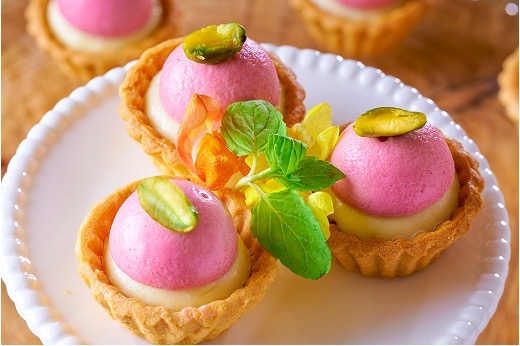ホワイトチョコのガナッシュにドーム型の甘酸っぱいフランボワーズムースを乗せたミニタルト。