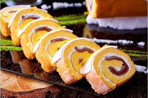 しっとりとした生地で、柚子風味の羊羹と生クリームを巻いたロールケーキ。