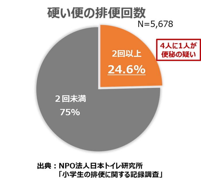 春先は、気温差も激しく、新生活へのストレスもあって自律神経が乱れ、便秘がちとなる人も多いのではないでしょうか?しかし実は今、大人だけでなく子どもにも便秘が増えています。NPO法人「日本トイレ研究所」が昨年11月に実施した調査(※)で、10日間の排便記録を分析したところ、小学生の4人に1人が、便秘の疑いがあることが判明。便秘が疑われる硬い便(「1 ころころ」または「2 ごつごつ」)が10日間で2回以上あった子どもが24.6%を占めました。