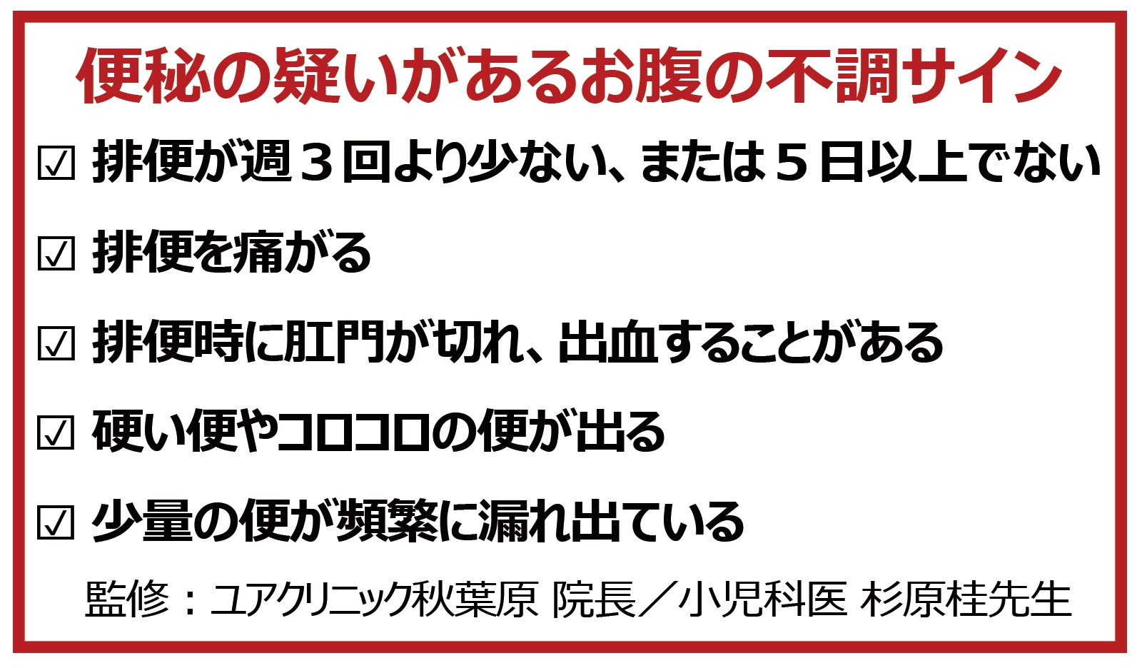 また、お腹が痛い、おならが臭い、食欲が低下するなども便秘のサインと言われています。お子さんの毎日の状態を把握し、「いつもと違う」と感じた場合には、医療機関で診察を受けることをおすすめします。