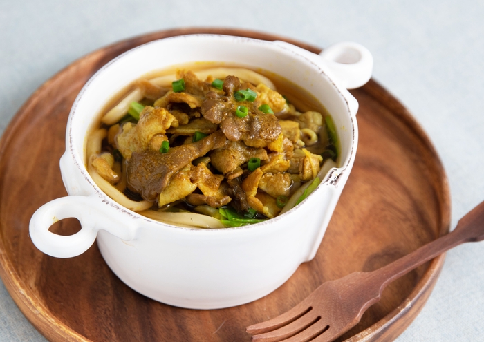子どもの好きな食べ物ランキングで不動の1位を誇るカレーを、作り置きレシピにしてアレンジしてみましょう。麺類はもちろん、炭水化物中心になりがちなご飯のトッピングにもオススメです。温かいうどんに、甘味のある春キャベツと温かい汁を合わせて「甘辛カレー煮」をトッピング。