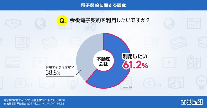不動産会社に「今後、電子契約を利用したいと思いますか?」と質問したところ、61.2%の不動産会社が「利用したい」と回答しました。