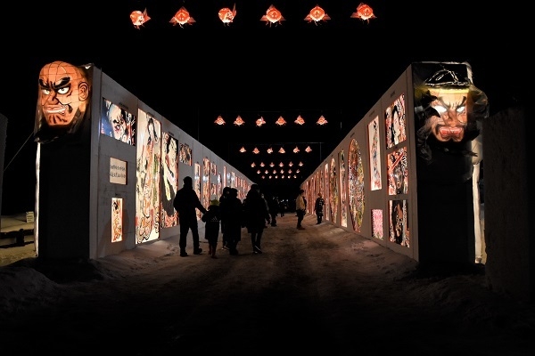 約150基に及ぶ大小様々な雪燈籠や雪像、約300基のミニカマクラ群が弘前公園内に配置され、灯りがともされると、照明に浮かぶ弘前城とあいまって幽玄の世界へ誘います。