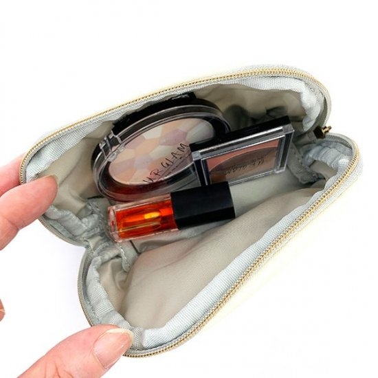 こちらのポーチには仕切りが付いており2ルーム仕様となっています。化粧ポーチの悩みのひとつが小さいコスメがなかなか出てこないこと!探しているとカチャカチャ音が鳴って気になりますよね。。。