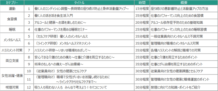 健康経営優良法人の認定要件も含む10以上の研修メニューがあります。アカデミアなどの専門家による監修コンテンツも含まれ、質の高い内容をご提供します。コンテンツは順次、追加・更新していきます。