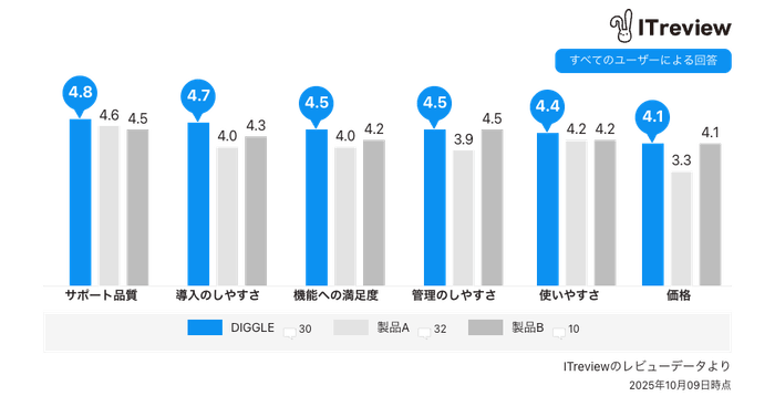 ITreviewでは、6つの項目(機能への満足度・使いやすさ・導入のしやすさ・管理のしやすさ・サポート品質・価格)それぞれにおいて、ユーザーが5点満点で満足度のスコアをつけます。「DIGGLE」は、全ての項目で4.0点以上を獲得しました。また顧客満足度は5点満点中4.5点を獲得しました。