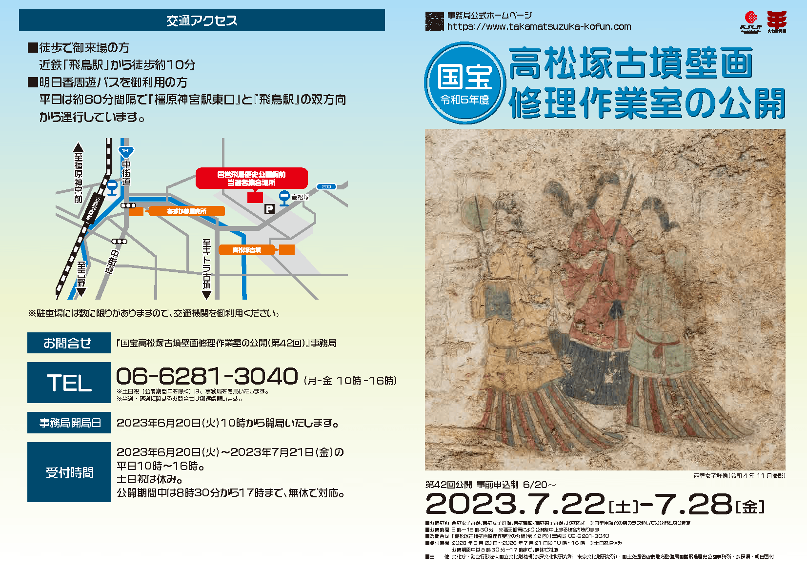 「国宝高松塚古墳壁画修理作業室の公開(第42回)」事務局にお電話いただくか、事務局ホームページにて、定員に達していない日時からご応募ください。