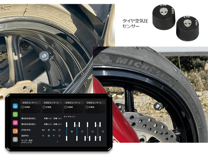 「空気圧」や「タイヤ温度」を秒間隔でモニタリングするタイヤ空気圧監視システム搭載。高圧・低圧の警告値の設定が前輪・後輪別々に設定できます。タイヤの異常をすぐに察知できます。