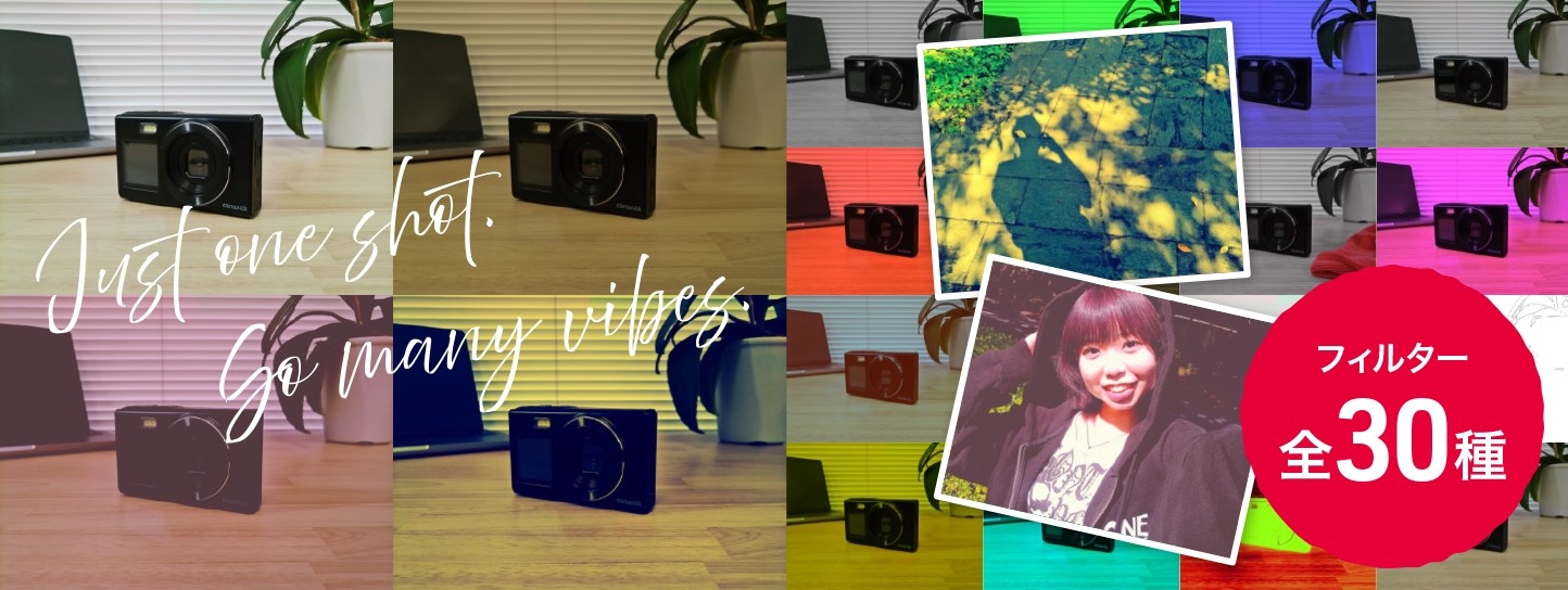 シャッターを押すだけで、懐かしさと今が重なる一枚に。さらに30種類のフィルター機能で日常をエモーショナルな世界観で彩ります。
