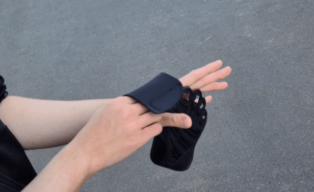 使う時はグローブの穴に指を通し、左右の面ファスナーを手首に回すだけ。