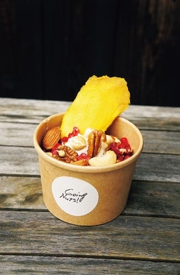 乳製品や卵を使わず、国産の葛・有機豆乳・てんさい糖、100%ナッツバターを使用。こだわりのナッツとドライフルーツ、滋賀県産の木イチゴをトッピング。
