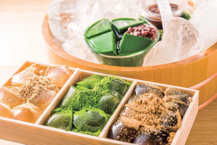 本わらび粉を使用、なめらかなわらび餅とほろりと溶ける抹茶寒天。