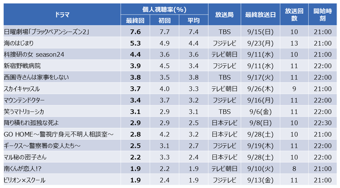 日曜劇場「ブラックペアンシーズン2」の最終回視聴率は7.6%、平均視聴率7.4%で他のドラマを大きく上回っており、2024年夏ドラマの中で各放送回を通して最も人気だったことがわかります。つづいて「海のはじまり」が5.3%で2位、「科捜研の女 season24」が4.4%で3位と、最終回に高視聴率を獲得しています。