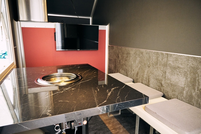 普段はキッチンカーとして利用する空間部分を個室焼肉ブース仕様として作り、来場されるお客様に完全個室の、無煙ロースター、エアコン、防音、吸音、を兼ね備えた、焼肉の匂いがつかない快適なプライベート空間を、ご提供いたします。