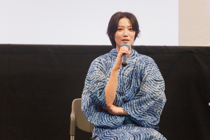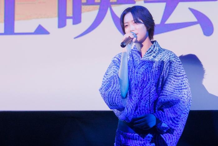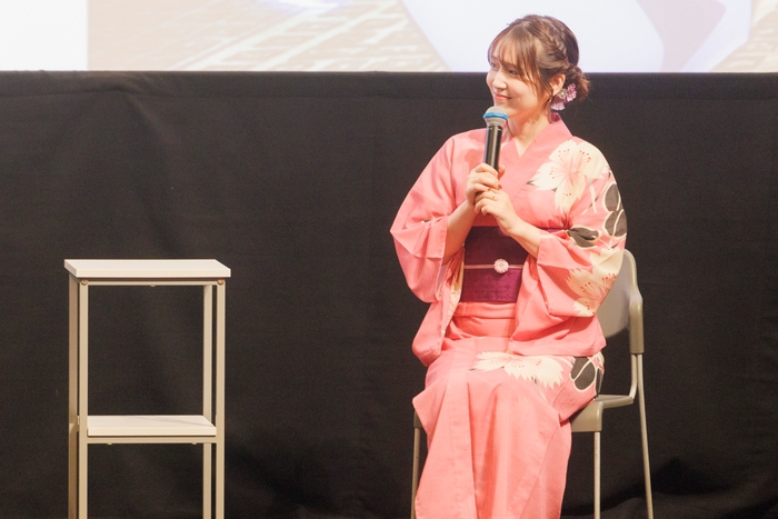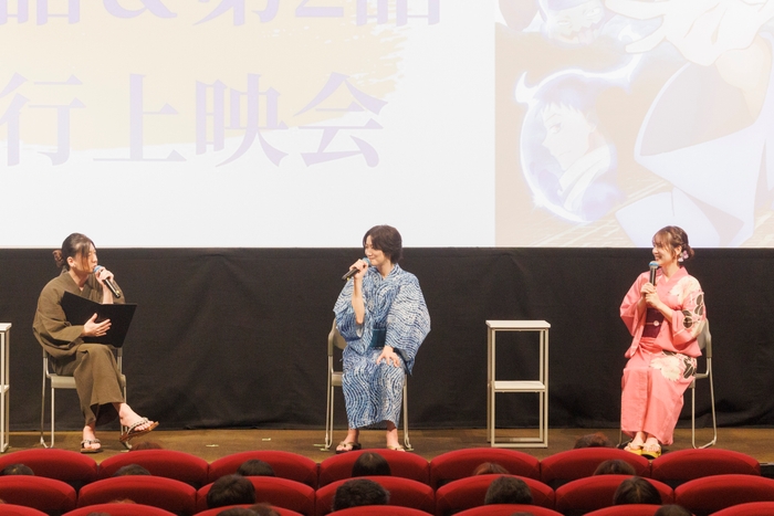 第1話と第2話の上映が終わり興奮冷めやらぬ中、司会進行を務める木村さんがステージに登場すると、そのままキャスト陣のトークショーへ突入。この日は登壇キャスト全員が、作品の世界観とリンクした浴衣で登場し、華やかな姿に客席からは思わず歓声が上がった。