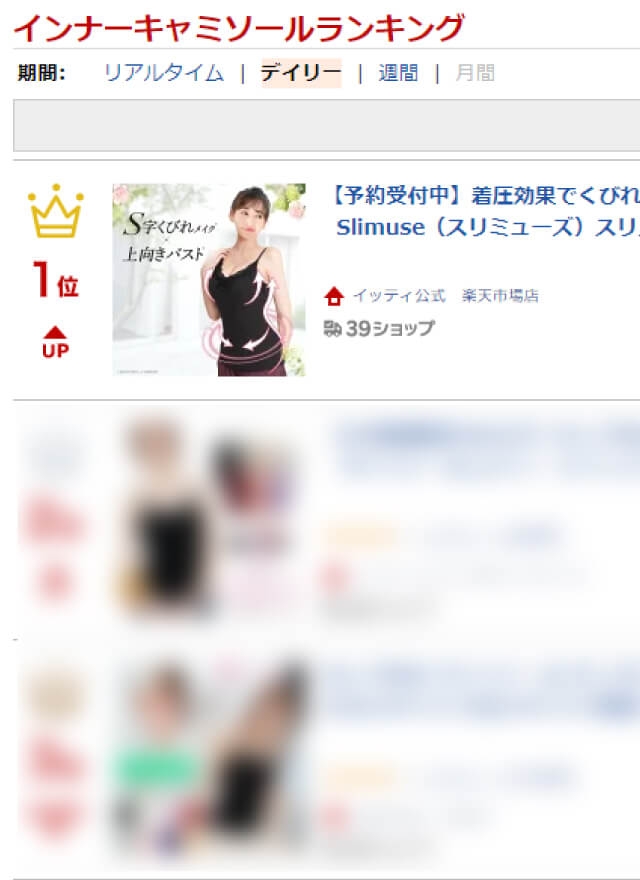 着圧シリーズSlimuse(スリミューズ)から新登場したスリムアップキャミソールは、予約販売分があっという間に完売しました。特に、商品開発の際にこだわった、独自の360°着圧構造や肌に優しい素材、そして見た目の可愛さがとても好評で、予約販売でご購入いただいたお客様からは、「着るだけでくびれゲットできて感動!」「暑い日に着てもムレないし快適!」「着圧ってバレないのありがたい」など、お喜びのお声を多数いただきました。おかげさまで、楽天ランキングのインナーキャミソール部門で、見事1位を獲得しました。