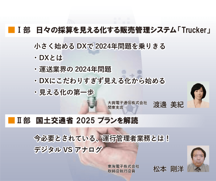 点呼機器およびアルコール検知器を開発・販売する東海電子株式会社(本社:静岡県富士市 代表取締役:杉本 哲也)は、 この度、 大興電子通信株式会社(本社:東京都新宿区 代表取締役社長 CEO兼COO :松山晃一郎)とタッグを組んで「物流業界の2024年問題 労務改善策、働き方改革を見出します!」(無料)を7月20日(火)と8月2日(月)に開催いたします。