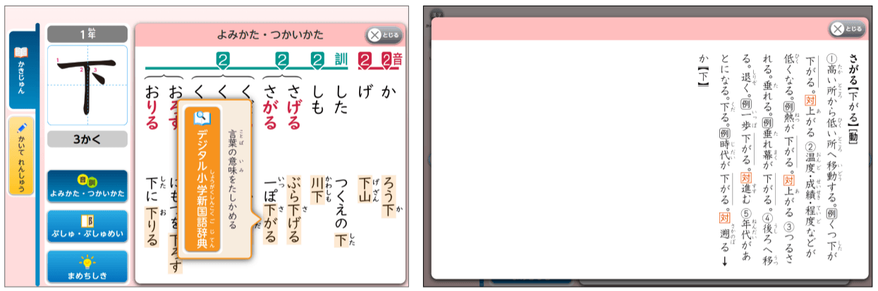 ●字の練習と共に言葉の力を増やす国語辞典との連携機能!