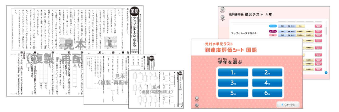 単元別評価テストだけでなく、プレテスト、全文テスト、聞き取りテスト、漢字テスト、学力調査型問題解決力テストなど、多彩な国語テストをご用意しました。様々な学習の場面に応じてご利用いただけます。