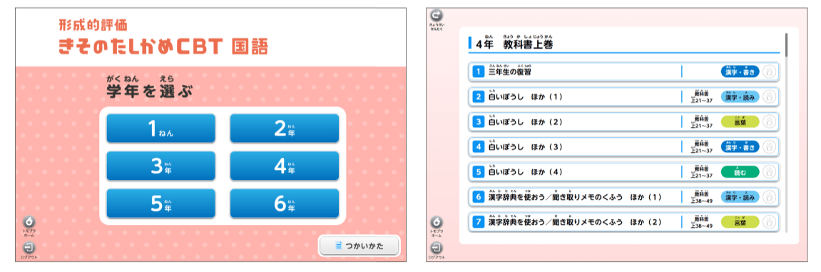 日々の学習の定着度を測る光村図書準拠の問題に加え、長期休み用の課題も収録しています。採点は全て自動で行われるため、先生方の負担は少なく活用いただけます。「形成的評価 きそのたしかめCBT」も利用者の学年を問わず全学年の範囲に取り組むことが可能です。