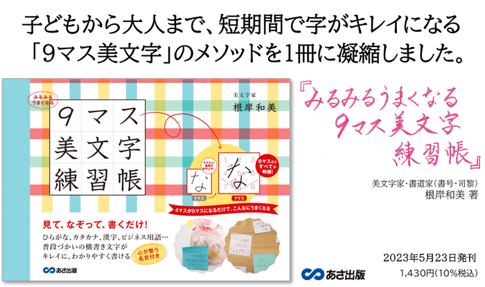 株式会社あさ出版(代表取締役:田賀井弘毅、所在地:東京都豊島区)は、根岸和美 著『みるみるうまくなる 9マス美文字練習帳』http://www.asa21.com/book/b620085.htmlを2023年5月23日に刊行いたします。