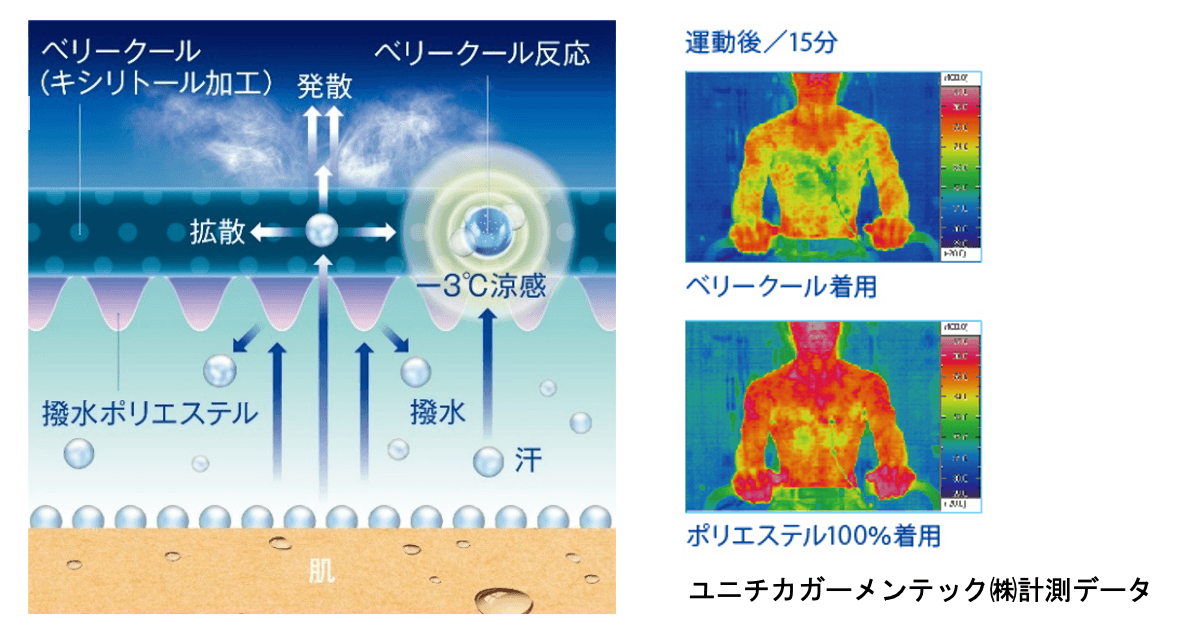 ウェア内を約3℃低く保つ「ベリークール」と肌面をドライにする機能を併せ持つ素材です。生地に配合したキシリトールが汗に反応して熱を吸収。また、汗を素早く吸収・拡散させて乾燥を促進させる生地構造を採用しています。クーリング効果と汗のベタつきのストレスを軽減させることで選手のパフォーマンスを向上させます。