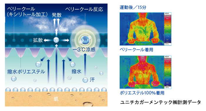汗をすばやく吸収・拡散させ、衣服内をドライに保つ「ベリークールドライ」