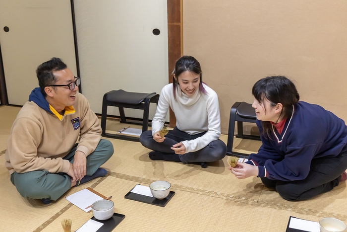 ・前半は茶道を理解していただくために、茶道の挨拶の仕方を習ったり、ペアになった方に気持ちを込めて抹茶を点てたり、相手の方から抹茶をふるまわれたりすることで日本人のおもてなしの気持ちを体感します。