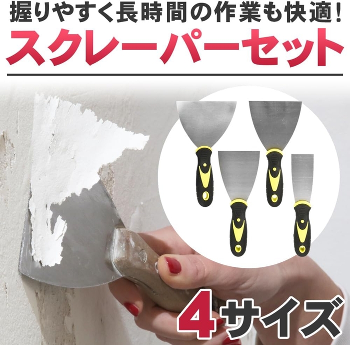 業務用としても使えるほど実用性に優れたスクレーパーは、異なる刃幅を4種類取り揃えておりあらゆる現場のニーズに応えます。持ち手にはフック穴が開いているため紐やタグを通すのはもちろん、そのままフックにかけて吊り下げることも可能です。工具箱を圧迫せず省スペースで保管できるのも嬉しいポイントです。