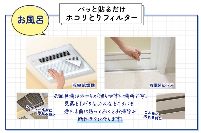 空調機器などの家電や排気口に使えるフィルターも続々増えているので、汚れが気になるところにパッと貼って簡単掃除♪