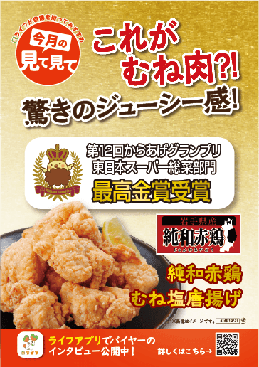 “おいしい” “ワクワク” “ハッピー” をお届けするライフコーポレーションは、一般社団法人日本唐揚協会主催の「第12回からあげグランプリ🄬 スーパー総菜部門(東日本)」にて最高金賞を受賞した「純和赤鶏むね塩唐揚げ」を大好評販売中です。