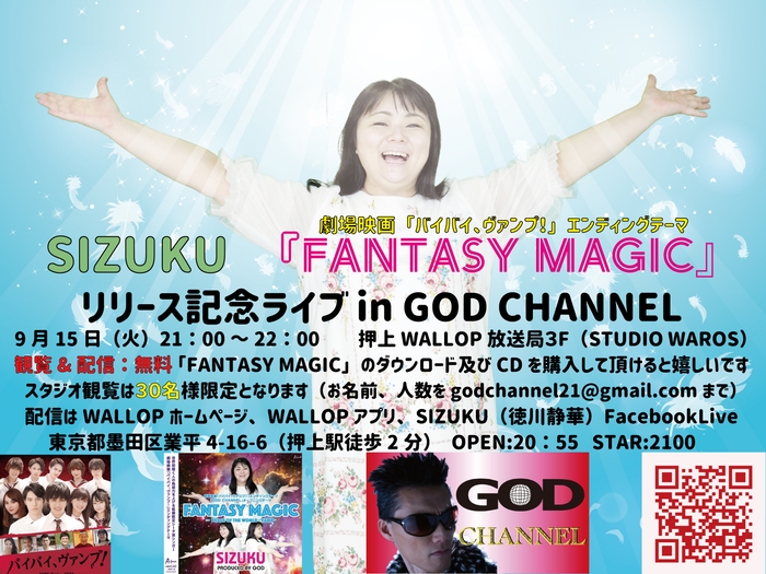 また来月9月16日に発売:A-force NEXT 販売:徳間ジャパンコミュニケーションズからメジャーリリースされるSIZUKUのニューシングル「FANTASY MAGIC」(映画「バイバイ、ヴァンプ!」エンディングテーマ)のリリース記念ライブ in GOD CHANNELが9月15日に開催され、スタジオ観覧及び配信(観覧、配信共に無料)が行われます。会場に来て下さり、CDをご購入いただいた方にはSIZUKUのサインや2ショット写真もゲットできます。ぜひ、スタジオ観覧、お待ちしています。なお、ソーシャルディスタンスを保つため、スタジオ観覧は限定30名となります。
