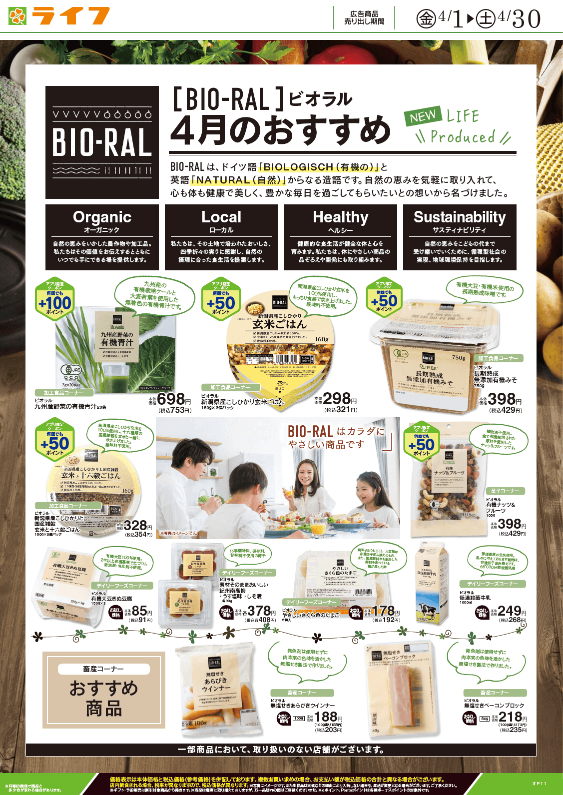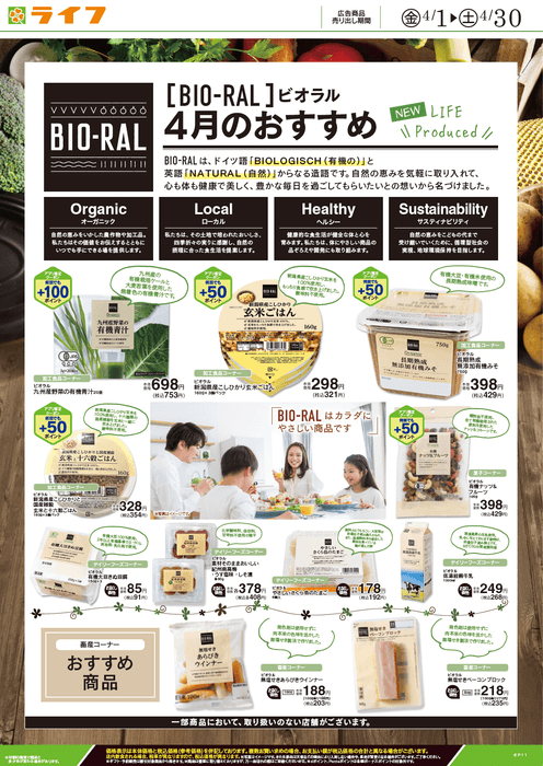 “おいしい” “ワクワク” “ハッピー” をお届けするライフコーポレーションは、健康志向のお客様におすすめしたいBIO-RAL(ビオラル)商品を、毎月お試し価格やポイントプレゼントなどでお得にご提供しております。4月のおすすめは「長期熟成無添加有機みそ」「低温殺菌牛乳」「無塩せきベーコンブロック」などを含む12品です。