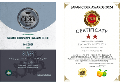 「サダハルアオキ SAYA2023」は、「INTERNATIONAL CIDER CHALLENGE 2024」において、銀賞を受賞し、ローズゴールド色、ほどよい甘さと酸味のバランスが良いとの評価をいただきました。