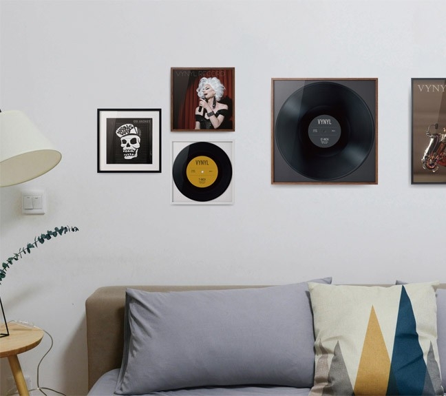 付属の背景マット紙を使用して、レコード盤をそのまま飾ったり、10インチレコードジャケットを飾ることも可能。壁掛けはもちろん、デスクなどにも飾れるスタンド付きです。