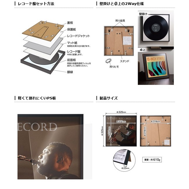 付属の背景マット紙を使用してレコード盤をそのまま飾ることもでき、CDの紙ジャケット(135mm角)を飾れる専用マット紙も付属しています。壁掛けはもちろん、デスクなどにも飾れるスタンド付きです。
