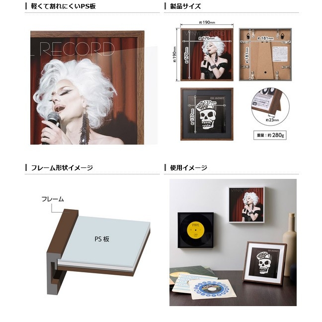 お気に入りの7インチレコードやCDの紙ジャケットを写真や絵画のように飾れるインテリアフレーム。7インチのシングル盤やEP盤のレコードジャケット(180mm角)がピッタリと収まり、写真や絵画のようにお部屋に飾れる薄枠でシンプルなインテリアフレームです。