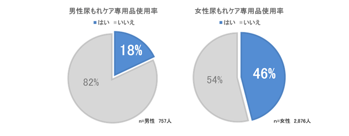 ・一方、女性の尿もれケア専用品使用率は、46%と半数近くが対処している。