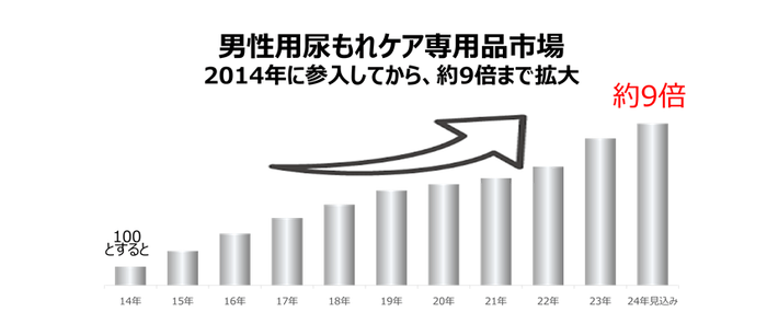なお、ユニ・チャームは2014年から男性用尿もれケア用品を展開しており、その市場規模は10年間で約9倍※に拡大しています。