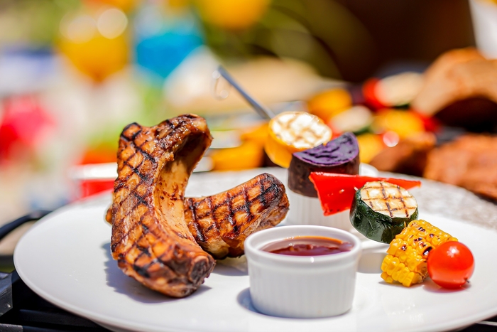 Cコース:冷製スープ/ガーリックシュリンプ/スペアリブのコーラ煮込み&季節野菜のグリル/シェイブアイス